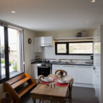 Cuisine fonctionnelle avec lave-vaisselle,frigo avec petit congélateur,four micro-ondes,percolateur avec cruche isotherme,grille-pain,presse-agrume,sets à fondue et à raclette,fer et planche à repasser,machine à lessiver-séchoir,…